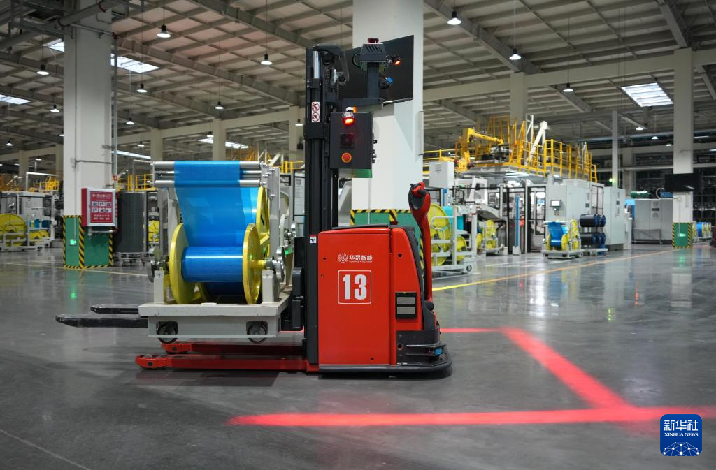 2月7日,在位于山东省广饶县的山东永盛橡胶集团有限公司轮胎生产车间,一台物流机器人在工作。