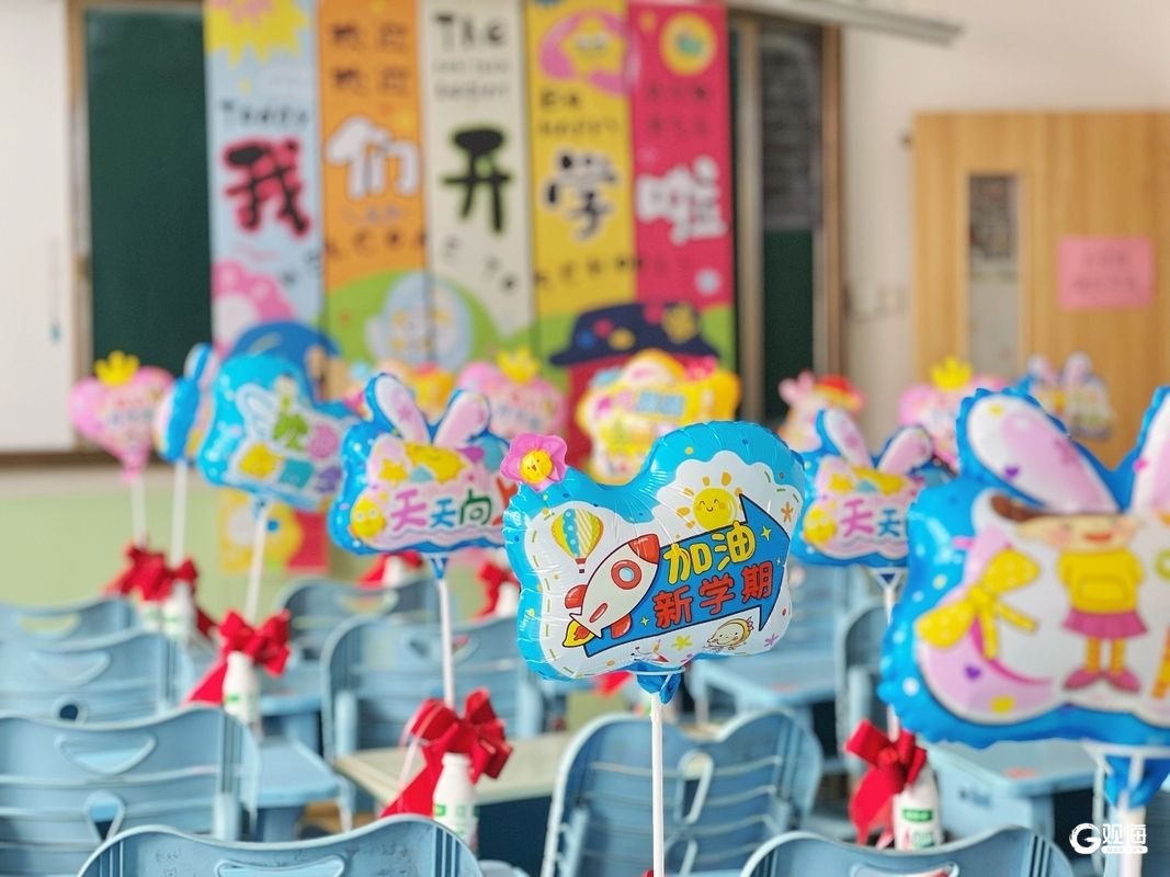 在青岛沧海路小学,老师们提前一天精心设计并装扮了教室。五彩斑斓的气球、随风飘动的彩带将教室装点得温馨又活泼。每名孩子都收到了一份报到“大礼包”,里面可能是崭新的文具、趣味十足的书籍,亦或是写满鼓励话语的明信片。这一切都在向孩子们传递着一个信息:新学期是充满希望和快乐的旅程。(青岛日报/观海新闻记者 王世锋 杨琪琪)