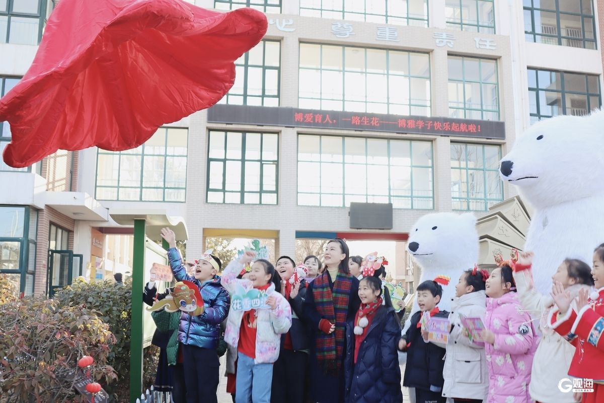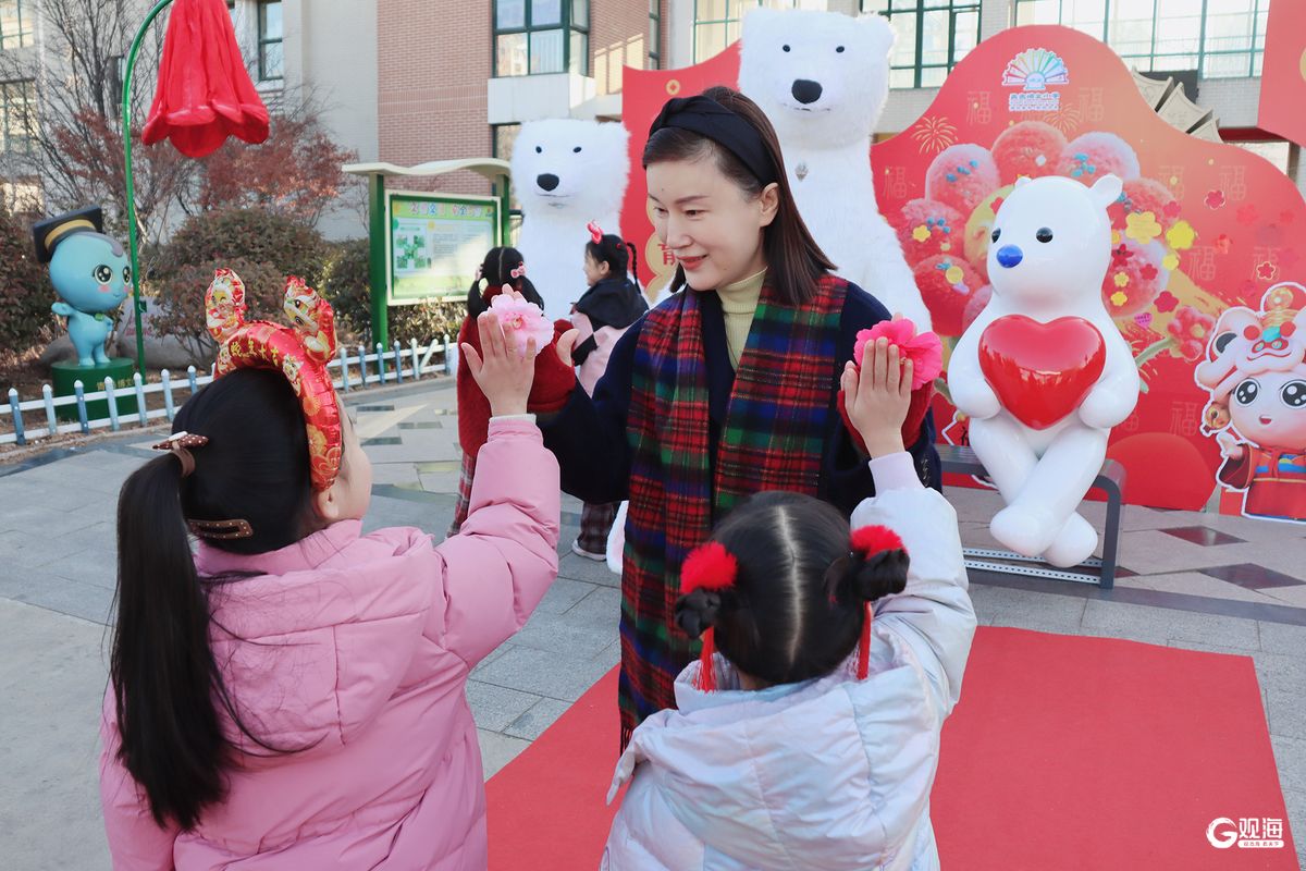 早上8点,青岛博文小学校园开始变得热闹起来,学生们头戴蛇年头饰,在家长的目送中步入校园。青岛博文小学校长杨伟与学生们击掌、拥抱,每一次温暖的触碰都是对学生最真挚的祝福与鼓励。教学楼下,一朵鲜艳的大红花跃然眼前。这是一朵声控大红花,它随着孩子们的欢声笑语徐徐绽放,寓意学校每名孩子都是独一无二的花朵。西海岸新区峨眉山路小学则开展了“新起点,送自己一朵小红花”主题入学仪式。学校教师早早站在学校门口,等待同学们的到来,走红毯过拱门、粘贴新学期目标……入学仪式上的小惊喜是对学生的期盼,也祝福学生用努力和坚持为自己赢得“小红花”。