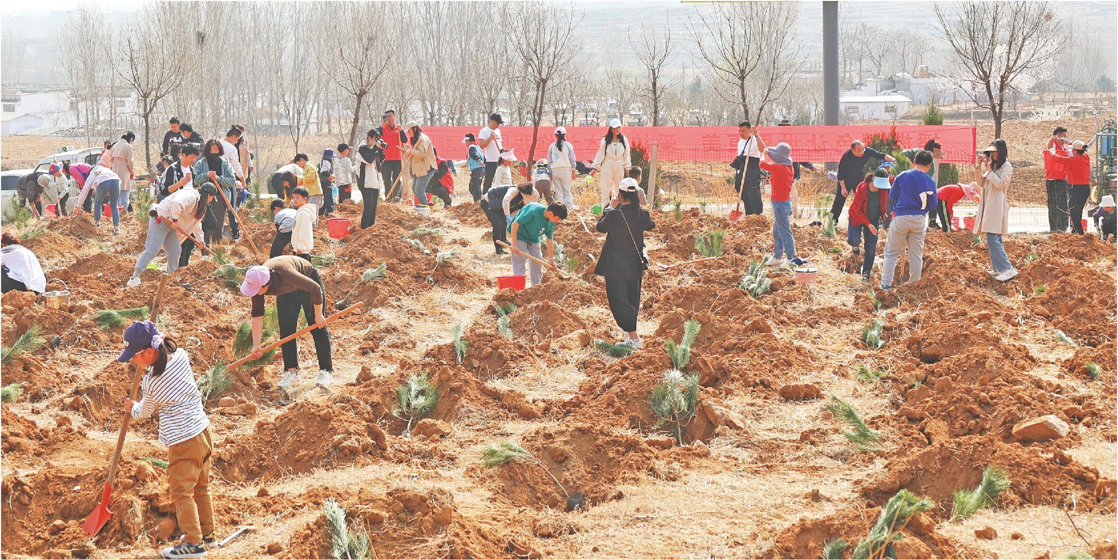 当前,山东省滕州市造林工作取得初步成效,莲青山区域已栽植黑松、红叶石楠、黄栌等各类苗木28.13万株,新栽和补植苗木共5.6万余株,修复破损树穴围堰1万余个,树林覆盖率日益扩大。图为近日莲青山区域植树现场。