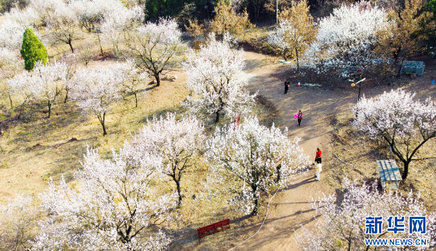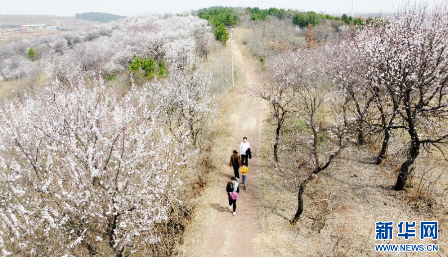 游客在山杏林内赏花踏春,乐享春光。新华网发(李学飞 摄)