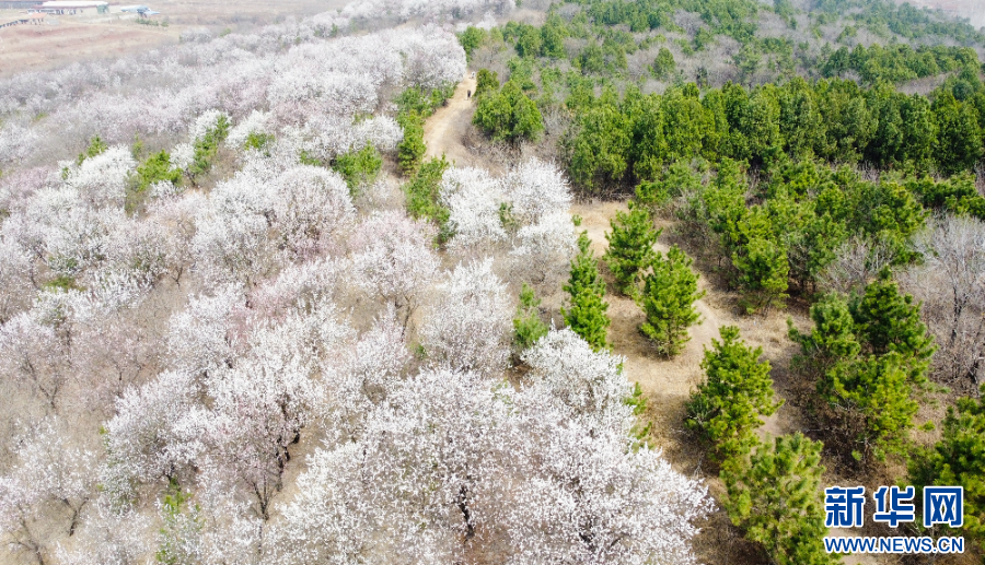 山东省郯城县泉源镇马陵山九道湾千亩山杏林内,山杏花次第绽放,美不胜收。新华网发(李学飞 摄)