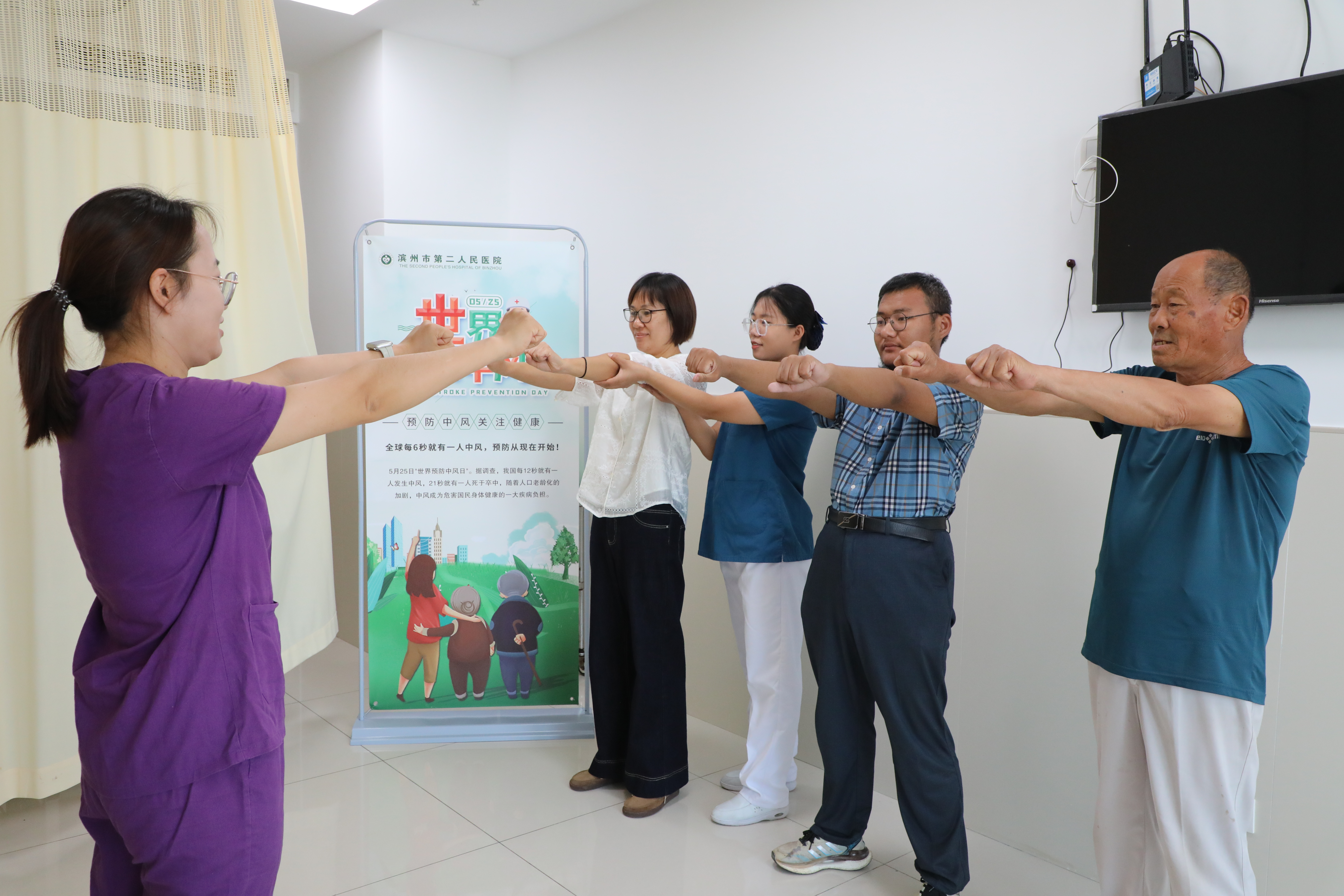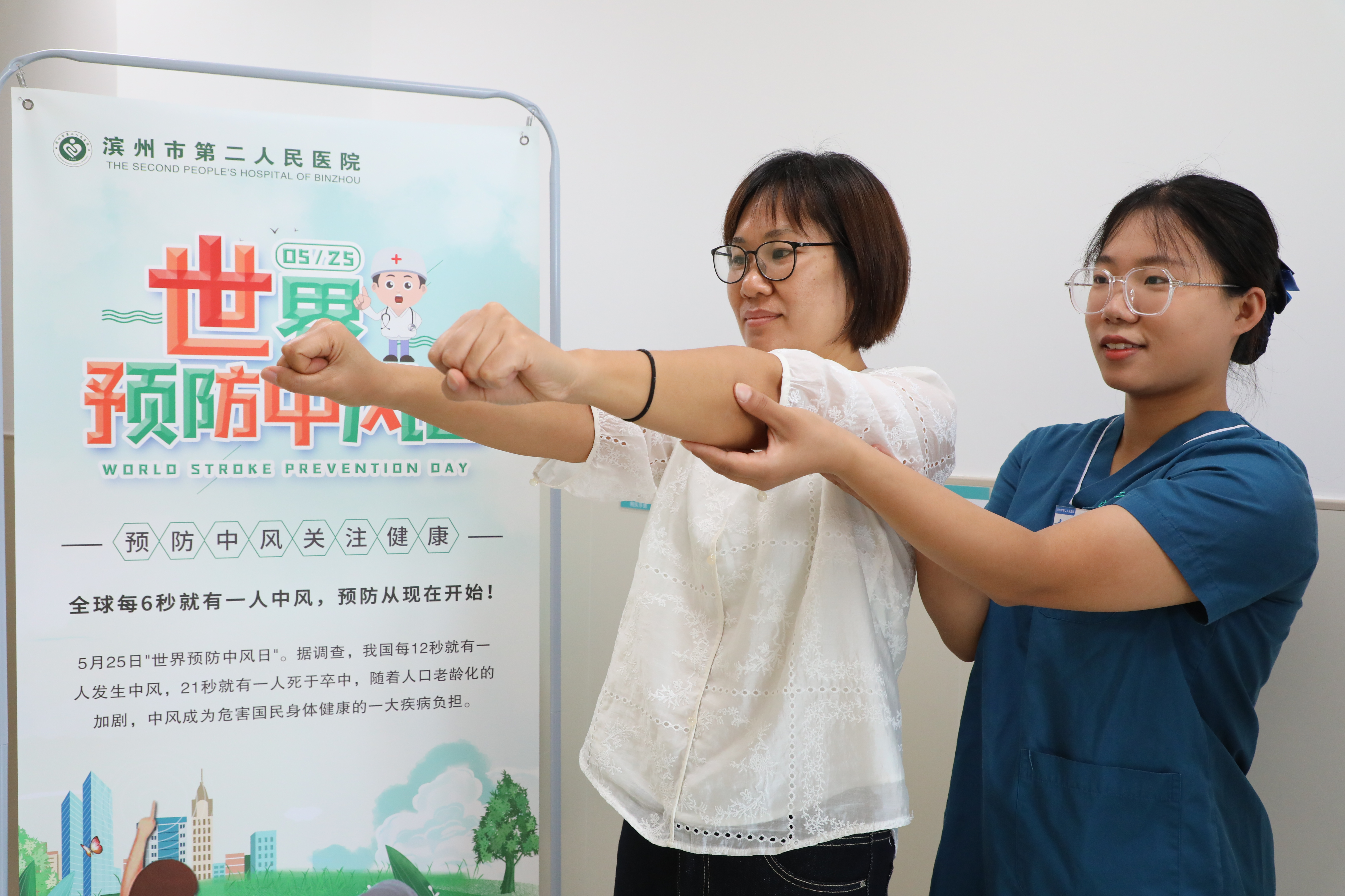 5月24日,在山东省滨州市第二人民医院,护士正在指导群众做预防脑卒中健康操。