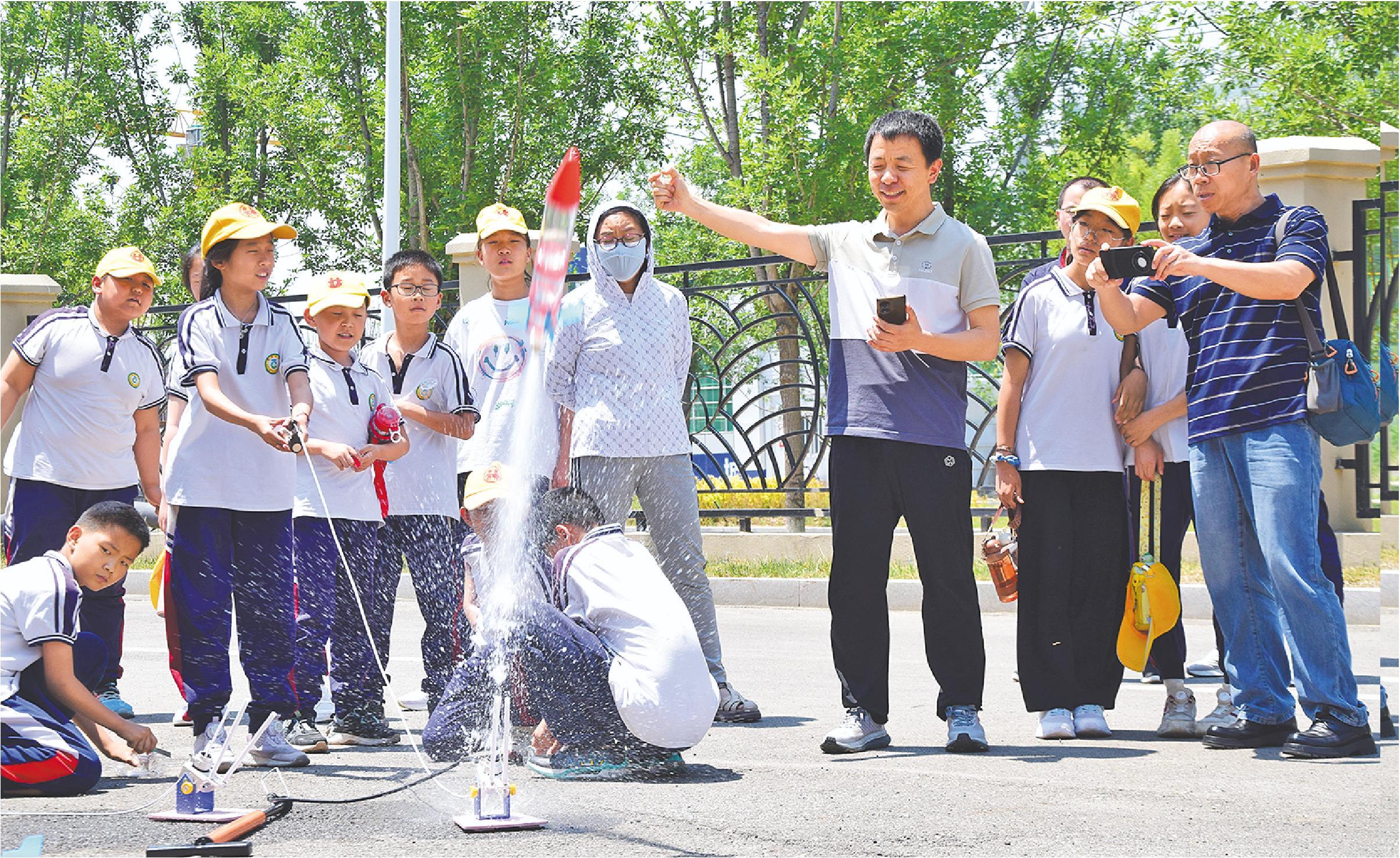 为更好搭建科学教育平台,起步区崔寨街道萃清小学组织了160余名学生全程参加启动仪式,听取科普讲座并参与互动体验,与最新科技装置零距离接触,亲身感受科技的魅力与神奇(上图为:小学生体验单级水火箭制作)。