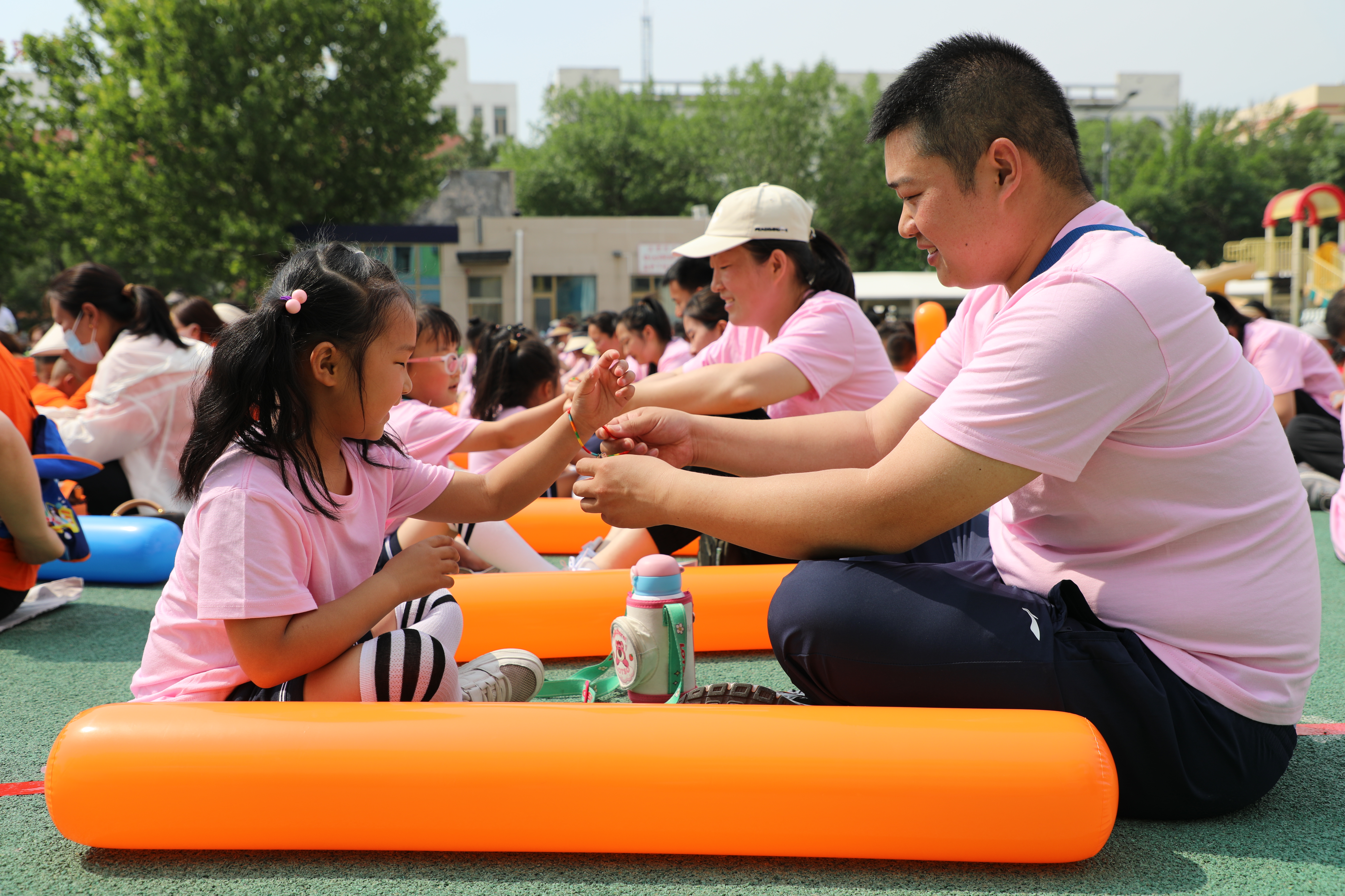 5月30日,山东省滨州市沾化区第一实验幼儿园开展了“迎端午 庆六一”双节亲子大联欢活动,家长与孩子参加充气棒游戏,增进亲子感情。