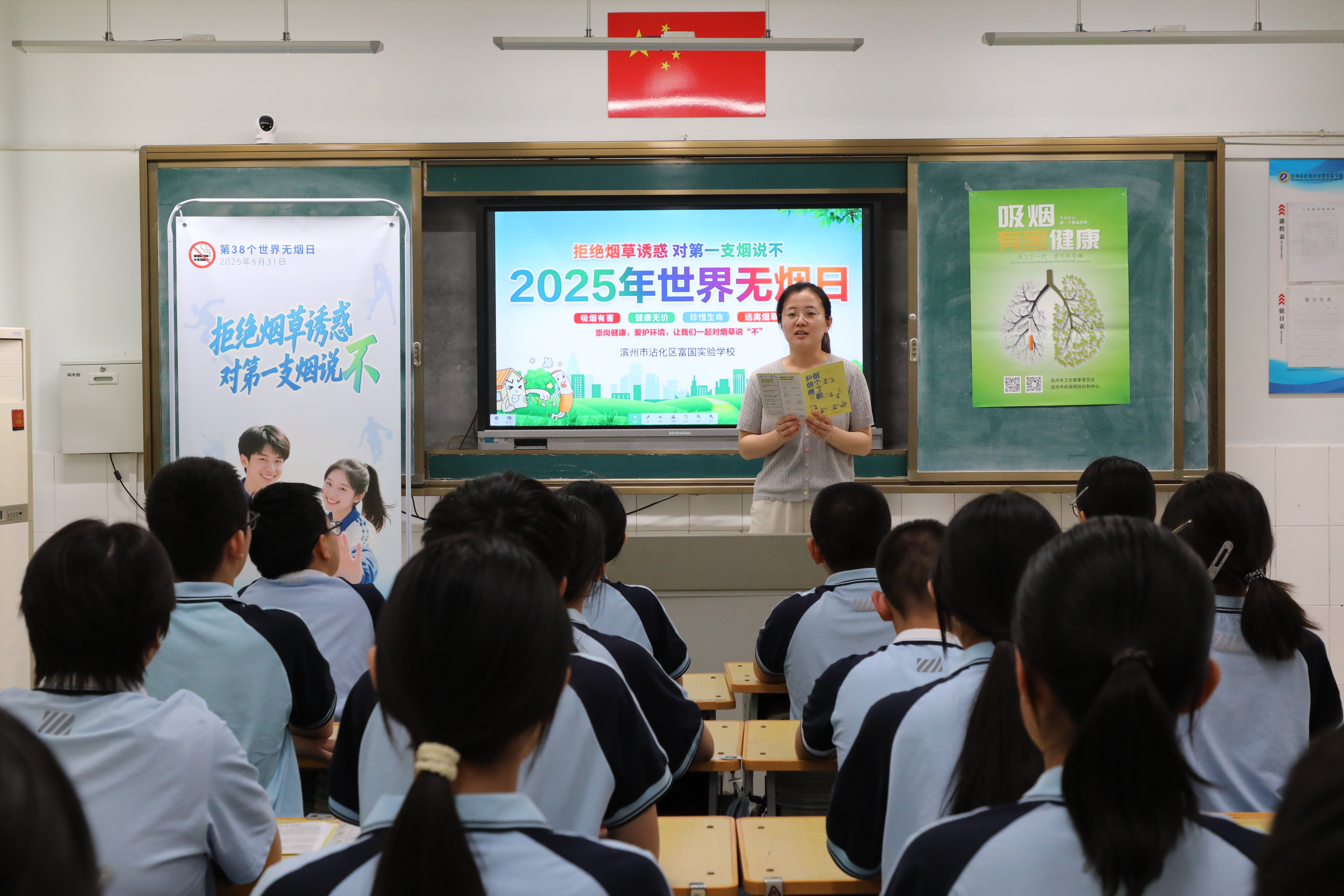 5月30日,山东省滨州市沾化区富国实验学校开展“青春无烟 共护成长”世界无烟日宣传活动。老师在向学生们讲解吸烟对身体健康的危害。