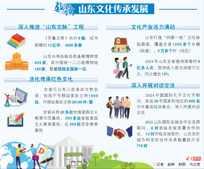厘清优秀传统文化家底和发展脉络,离不开典籍这一载体。山东深入推进“山东文脉”工程,近年来领衔担纲了全球汉籍合璧工程、《永乐大典》以及《中华医藏》、《子海珍本编》等国家重大项目,《齐鲁文库》、《儒典》、《齐书》等成果不断涌现。同时,做好古籍的普查登记、数字保护、整理出版等工作,深化价值研究、创作挖掘、数字开发、大众普及,让古籍里的文字“活”起来。