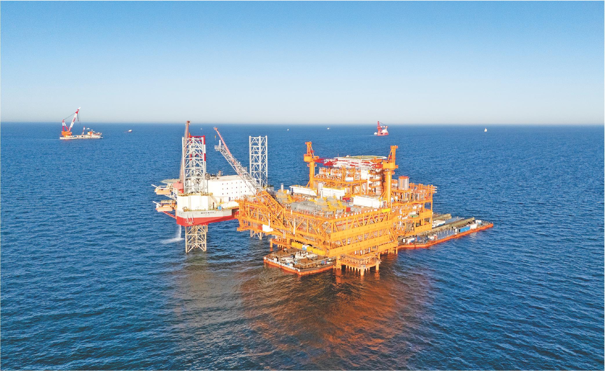 本次安装的中心处理平台是一座集生产、生活为一体的3层8腿多功能海洋平台,高度22.8米,设计重量超2万吨,是渤海海域重量最重、外形尺寸最大的海上油气平台。