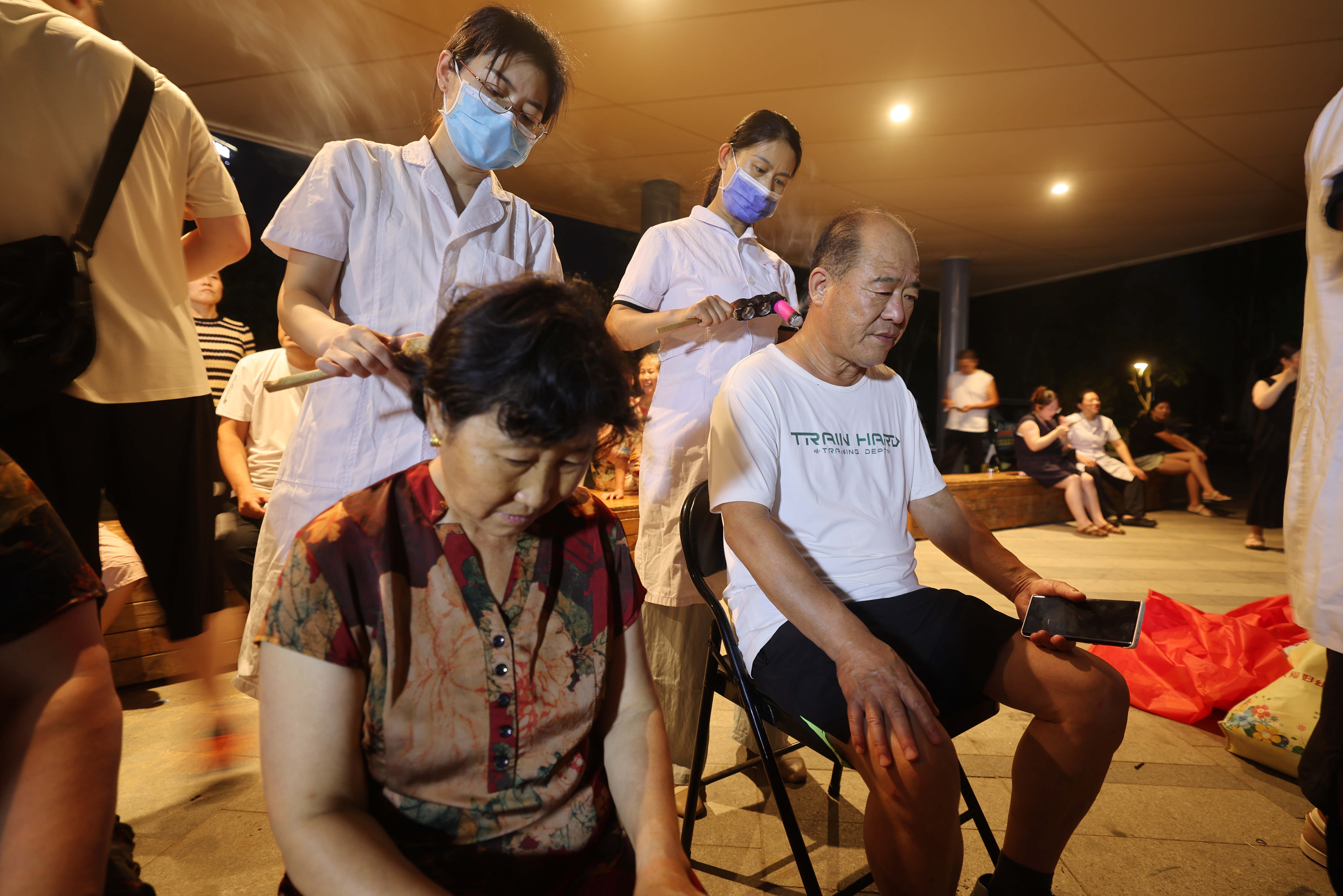 7月16日晚,在山东省沂南县界湖公园,医护人员在为市民进行艾灸。