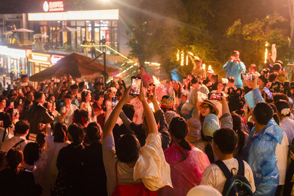 灯火次第点亮,奏响浪漫狂想曲。入夜,柿岩古村同步跌入璀璨星河,成为名副其实的“夜游天堂”。民族摇滚乐队、异域风情舞蹈、篝火联欢晚会轮番点燃夜晚。(李文惠)