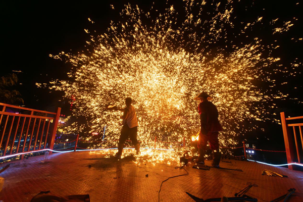 暮色四合,红叶柿岩化身梦幻国度,极致的超级“夜场”就此开篇。千年绝技打铁花与现代技艺完美融合,“心形电钻打铁花”震撼上演。水上火壶更添奇幻光影,水火相融间,万千金丝如瀑倾泻,火树银花绚烂绽放。七彩祥云腾空而起、唯美如诗,如漫天流萤,似星河倒灌。