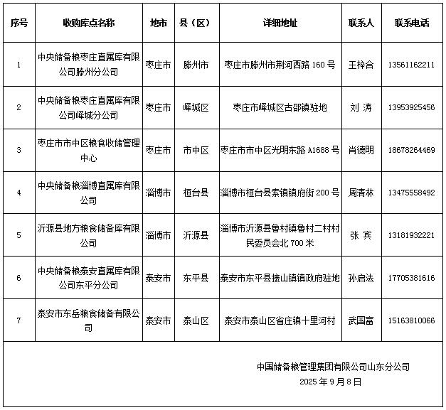 根据《国家粮食和物资储备局关于在江西山东两省启动2025年最低收购价执行预案的通知》,自2025年8月9日起在山东省内符合条件的地区启动小麦最低收购价执行预案。现将第七批收购库点公告如下:
