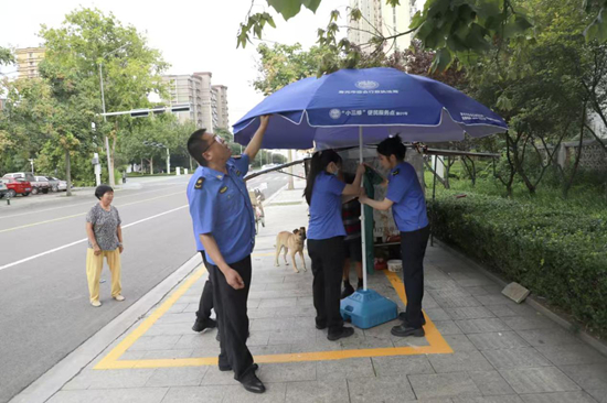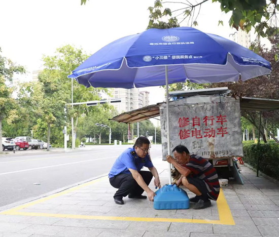 如今,漂泊不定的日子已成过去,固定划设的黄色实线框、醒目的蓝色折叠遮阳伞,给了宋师傅一个风雨无阻的“安心家”,伞面上清晰的“‘小三修’第10号”标识及监督电话,给人留下了规范管理的印象,同时也是宋师傅合法安心经营的象征。