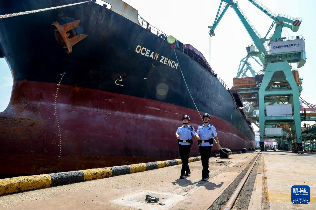 10月1日,山东日照出入境边防检查站的民警坚守一线,通过人工巡查、登轮检查等,维护国际船舶在港安全,保障口岸出入境通关高效畅通。新华社记者 郭绪雷 摄