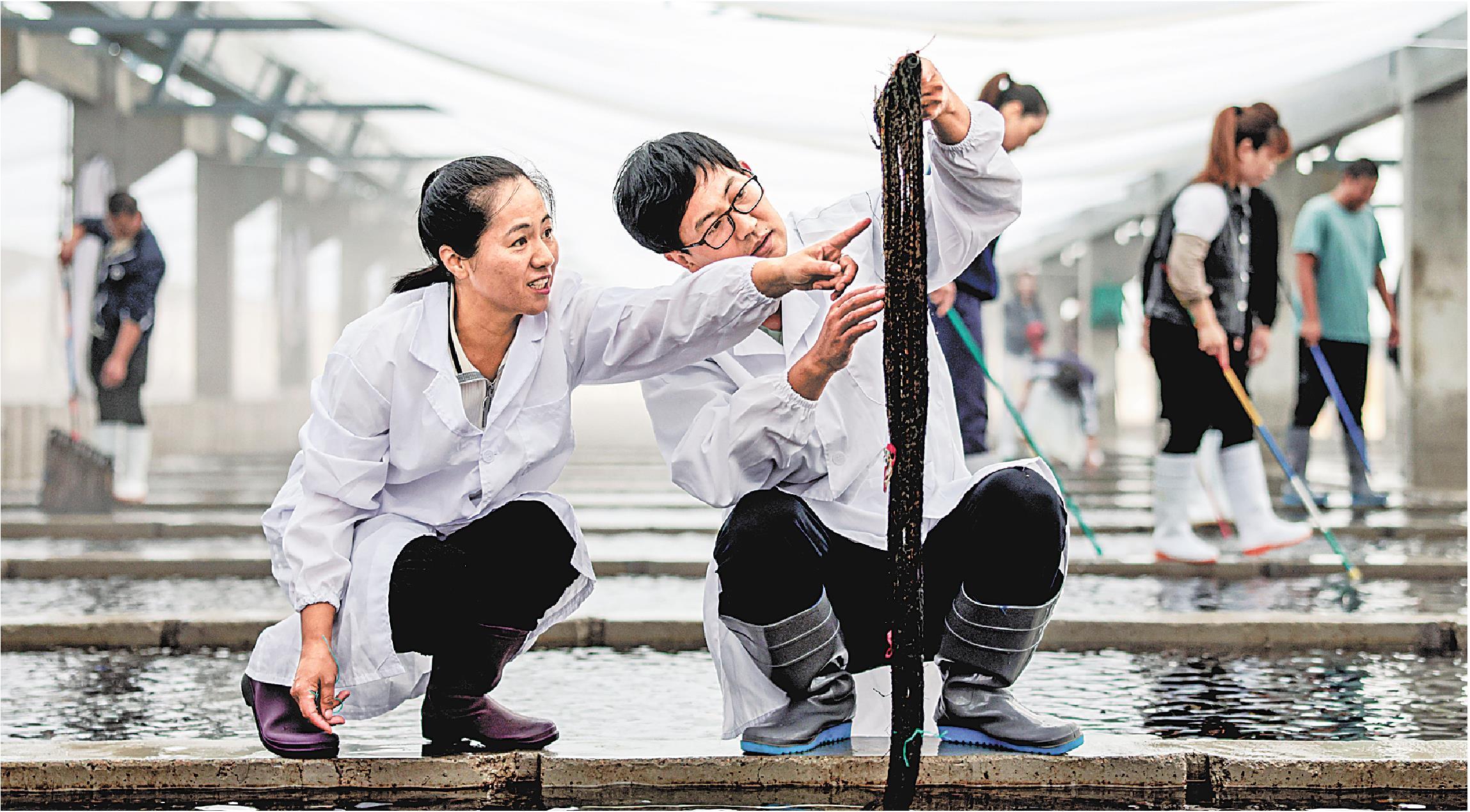 连日来,在山东荣成的寻山集团海带育苗车间,技术人员分析苗种长势,养殖工人进行育苗作业。每年9月至11月初为海带育苗期,11月下旬进入海带播种阶段。