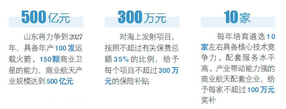 据介绍,瞄准巩固东方航天港的“海上发射优势”和全省的“液体火箭试验优势”,山东将着力提升火箭制造能力和新型火箭研发能力,推动火箭航班化发射。对海上发射项目,按照不超过有关保费总额35%的比例,给予每个项目不超过300万元的保险补贴。突出“航天应用+大数据+人工智能”融合发展,对符合相关规定的卫星数据算力交易场景和卫星应用大模型产品,分别给予每个不超过500万元和100万元奖补。