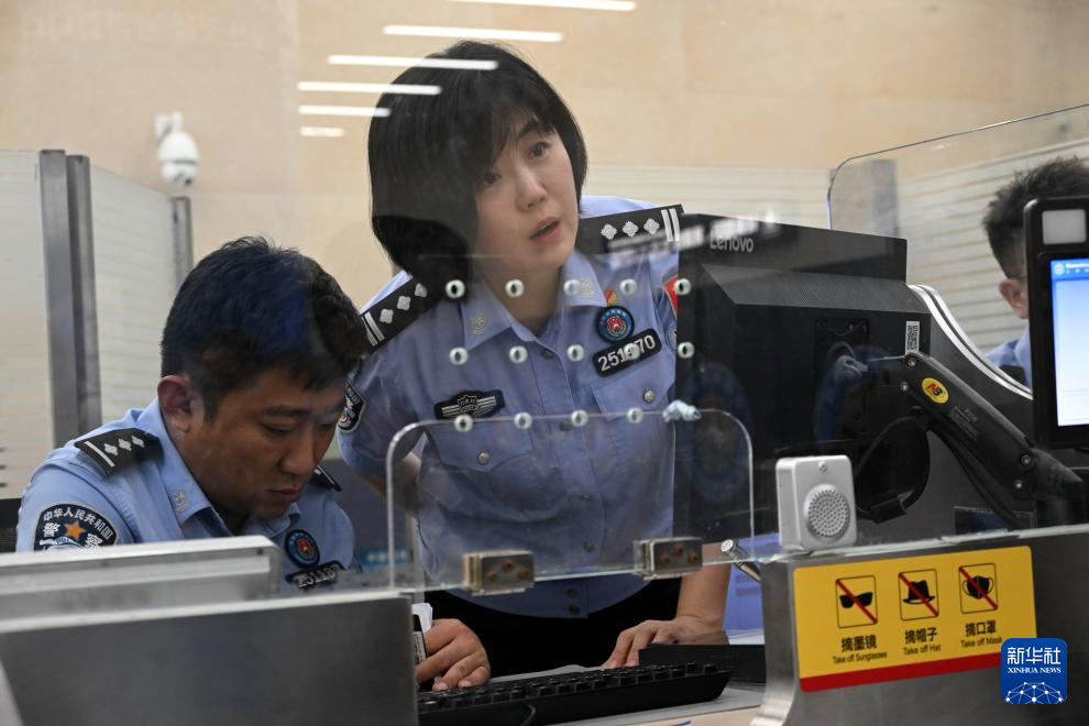 10月14日,移民管理警察曹锐(右)在验证台帮助一线民警核验护照。