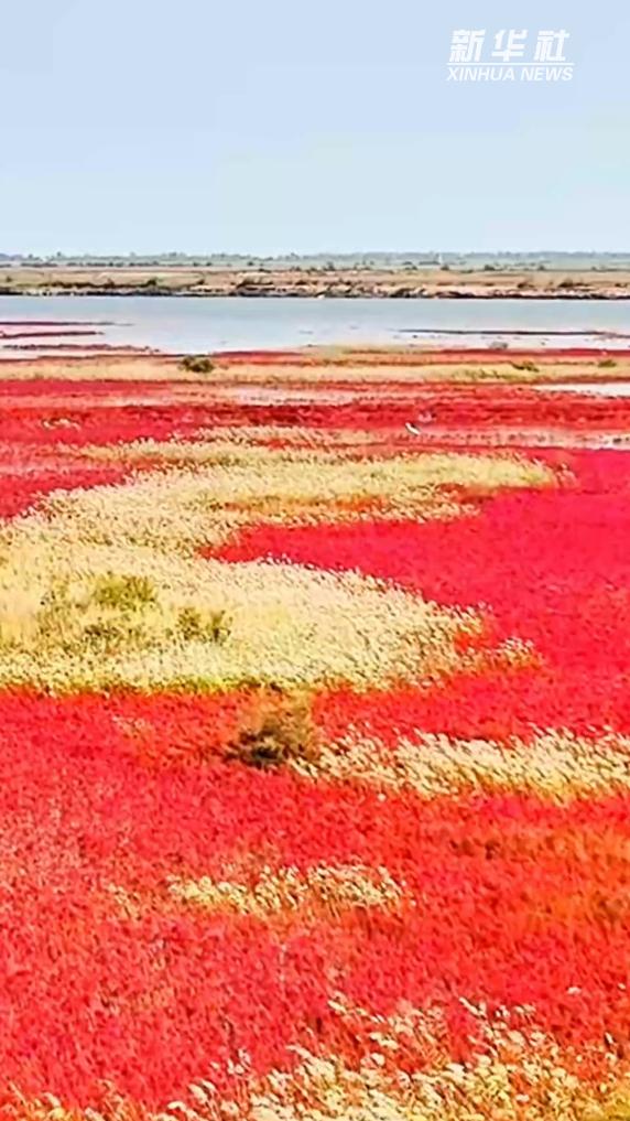 金秋十月,山东垦利黄河入海口滨海滩涂上,连绵不绝的盐地碱蓬焕发绛红,如一块巨大的天然红毯铺展于天地之间,犹如火焰般热烈而鲜艳。
