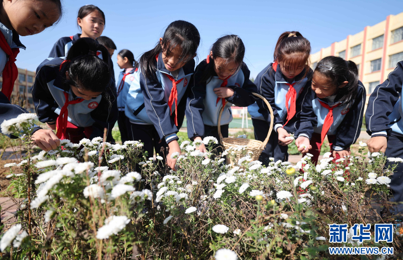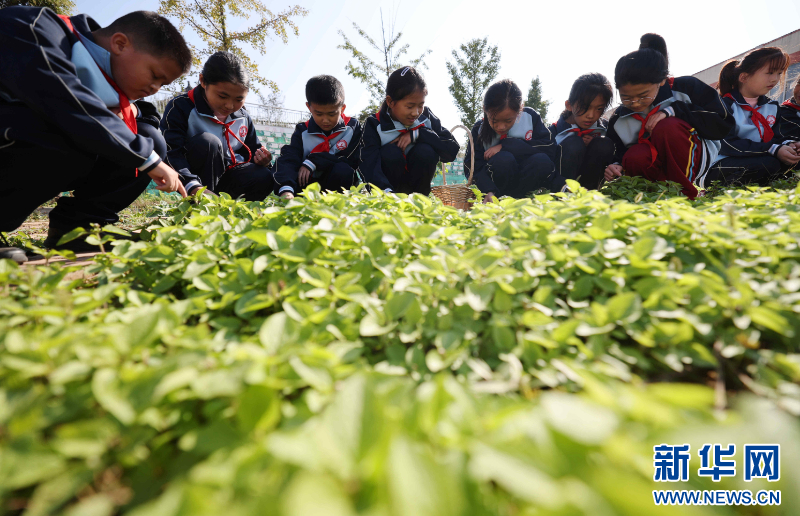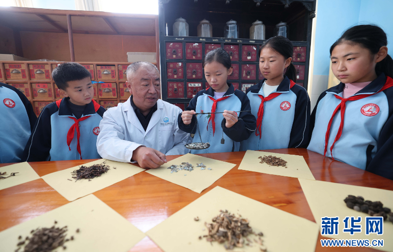 小学生们在中医师的指导下体验称量中草药。新华网发