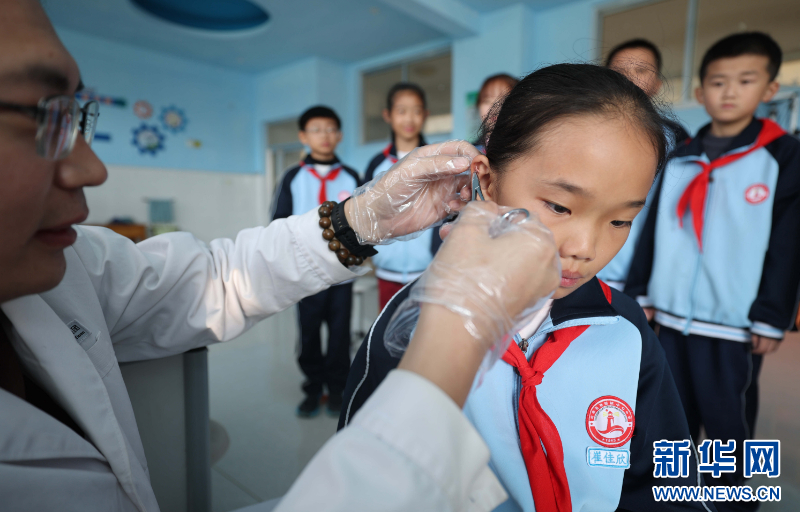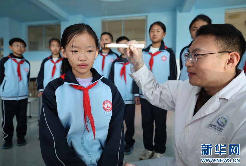 中医师在给孩子们讲解耳部穴位压豆疗法。新华网发
