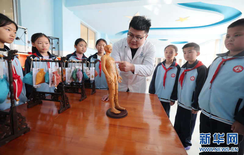 中医师通过人体穴位模特向小学生讲解中医知识。新华网发