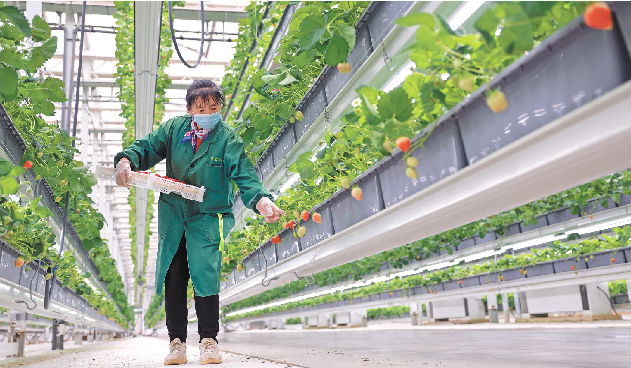 10月25日,在山东省聊城市茌平区信发现代农业产业园智能玻璃温室大棚里,工人在采摘草莓。