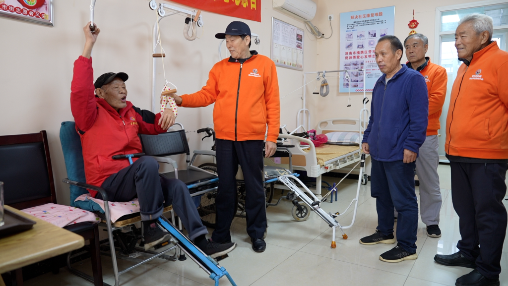 新华社济南10月29日电(记者丛佳鑫)“胡老师,今天练得怎么样?身体舒服些了吗?”“好多了,感觉手不发麻了。”在山东省济南市槐荫区营市街街道综合养老服务中心,70岁的银龄志愿者倪玉勇正在指导81岁的胡苏本老人活动身体。此时,胡苏本坐在装有滑轮吊环的椅子上,用一只手拉动牵引绳,带动另一侧手臂被动拉伸——这是倪玉勇带领“倪师傅爱心发明志愿团队”专为行动不便的老人发明的“活动神器”之一。