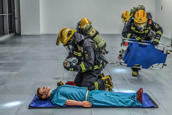 现场救援迅速展开。侦察组利用无人机构建立体网络,实时回传火场信息;灭火攻坚组抵达着火层下区,架设水枪阵地遏制火势;搜救组携带热成像仪、生命探测仪等专业设备深入浓烟区逐户搜救;举高消防车、壁挂水幕器、系留无人机与室内力量形成“内外夹攻”之势。经多轮扑救,所有被困人员被成功转移,“大火”被彻底扑灭,演练圆满结束。