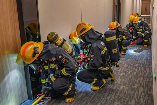 演练模拟该金融中心45层一办公室因电器短路突发火情,起火点标高236米,高温烟气迅速蔓延。晚上8时,演练正式开始。单位消防控制室确认火情后,立即启动应急预案,联动消防设施,组织人员疏散并报警,微型消防站同步进行先期处置。