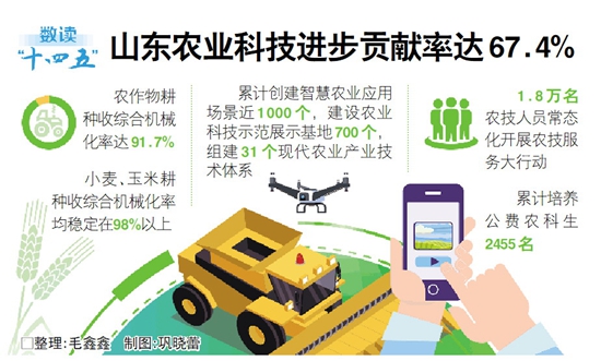 近年来,山东以科技创新和数字建设为关键支撑,赋能农业农村发展。在科技创新方面,突出抓好农业科技领军企业培育,遴选建立1000家科技企业库,强化智能农机装备研发推广,全省农业科技进步贡献率达到了67.4%;在数字建设方面,实施数字农业突破行动,建设“齐鲁农云”数字乡村大脑,已累计创建智慧农业应用场景近1000个。(记者 修从涛 曾轲 赵雅南)