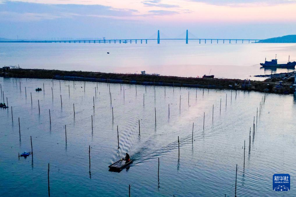 11月10日,在山东省荣成市桑沟湾海洋牧场,养殖工人在养殖区穿梭作业(无人机照片)。