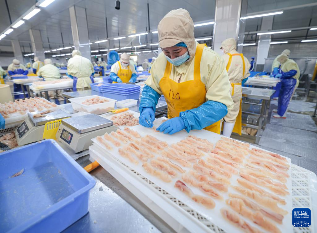 11月10日,山东省荣成市俚岛镇一家水产品加工企业的工人在加工鳕鱼制品。