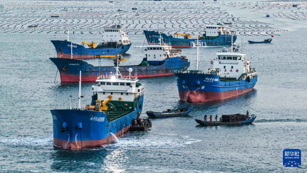 11月11日,在山东省荣成市爱伦湾海洋牧场,运鲜船在装运鲍鱼南下福建越冬(无人机照片)。
