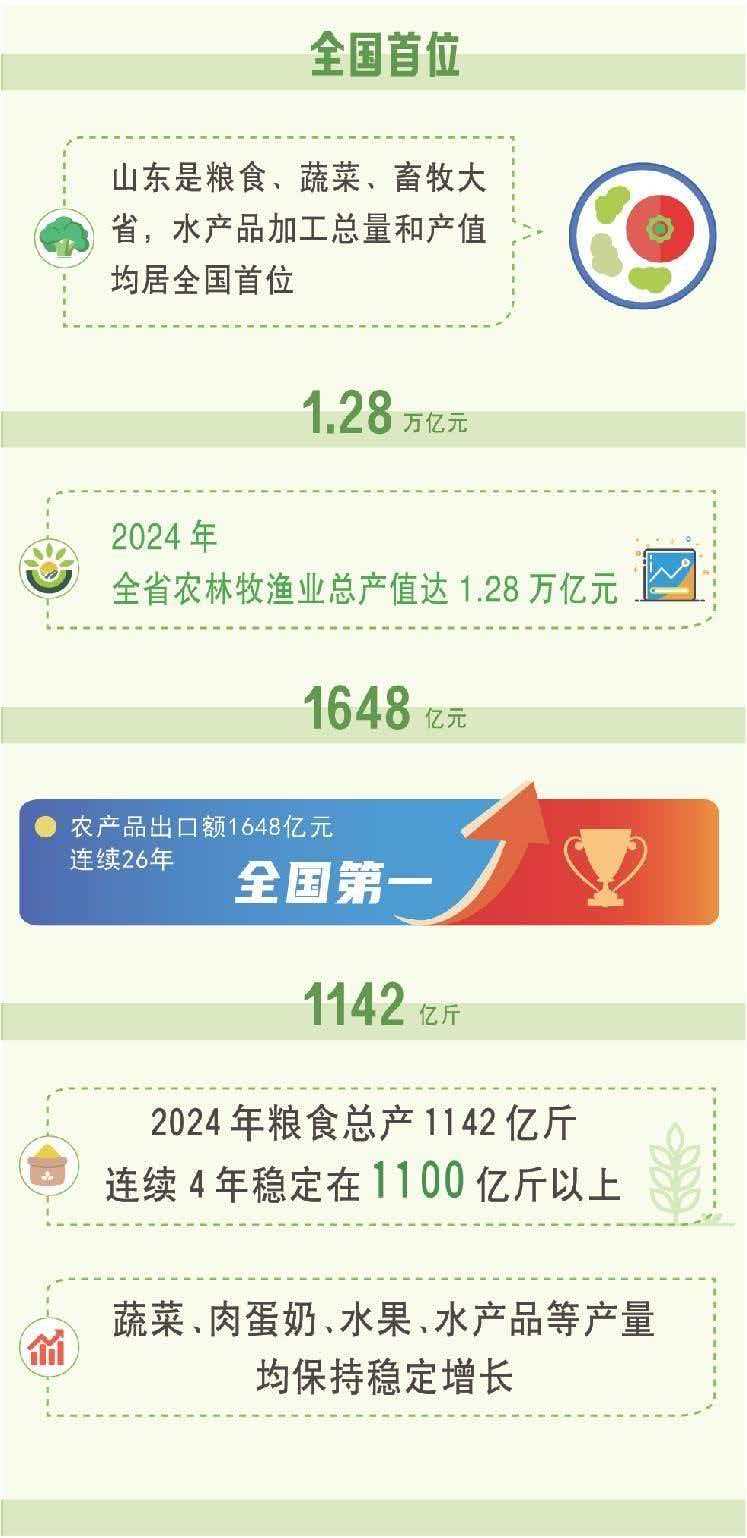 山东是粮食、蔬菜、畜牧大省,水产品加工总量和产值均居全国首位。2024年,全省农林牧渔业总产值达1.28万亿元,农产品出口额1648亿元,连续26年全国第一。粮食总产1142亿斤,连续4年稳定在1100亿斤以上;蔬菜、肉蛋奶、水果、水产品等产量均保持稳定增长。