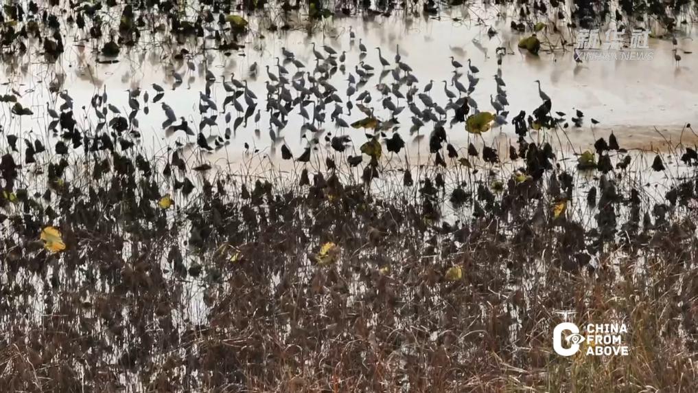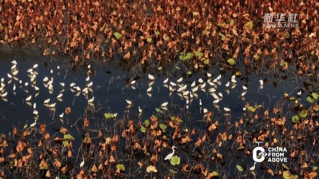 枯萎的荷叶与莲蓬在水中静立,以嶙峋的枝干,勾勒出风骨的线条,成群的白鹭是这幅画卷的精灵。它们时而从金色的苇丛中翩然惊起,在水面划出灵动的弧线;时而悠然伫立于浅滩,在残荷的倒影间凝成宁静的音符。这一动一静之间,尽显湿地的盎然生机。