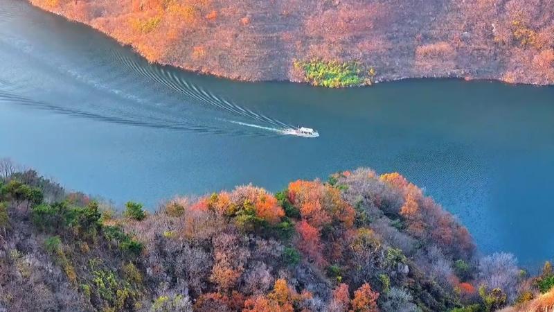 湖面如蓝绸舒展,两岸山林褪去翠绿,换上橙红、明黄的斑斓盛装。张宁 摄