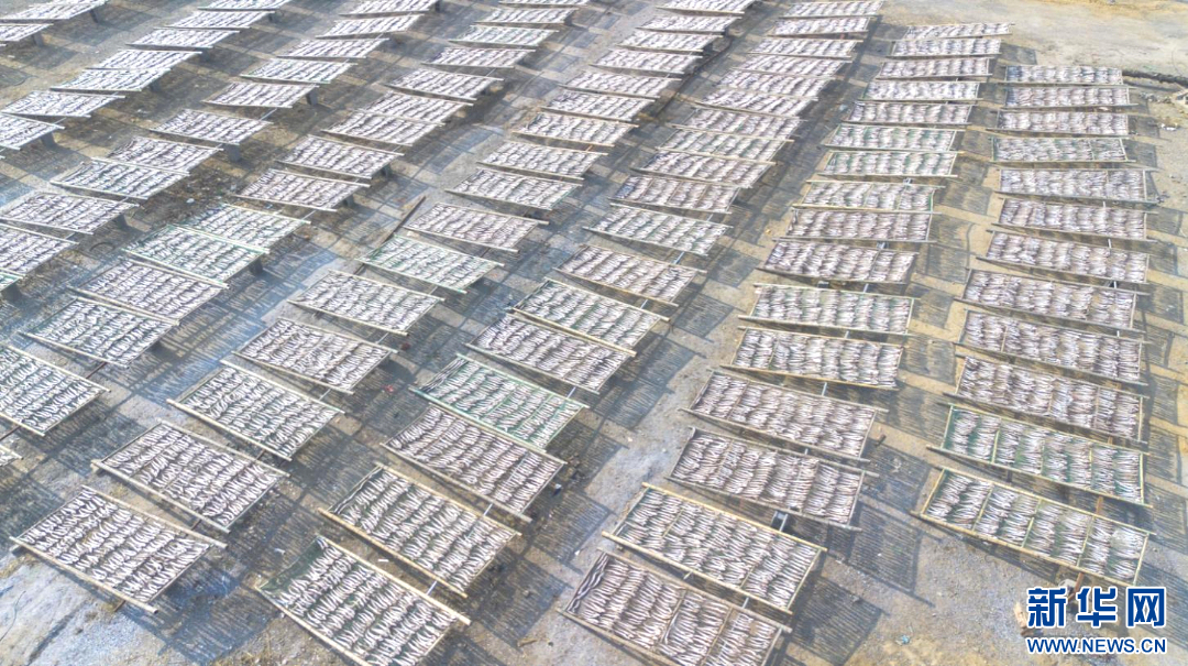 在日照市岚山区安东卫街道,鱼干批量晾晒。新华网发(林坤 摄)