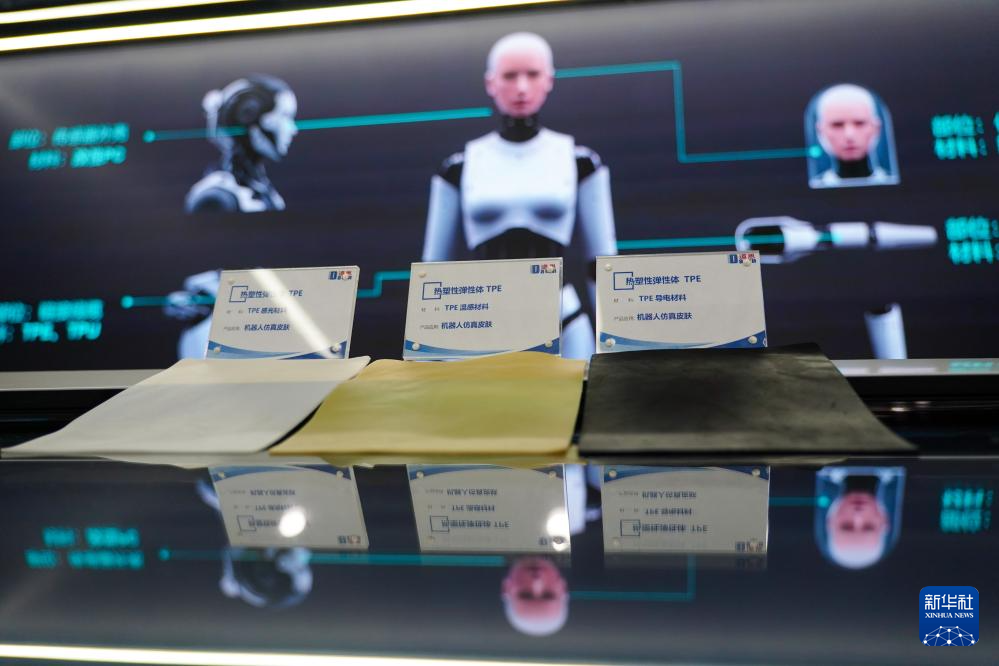这是在位于龙口市的山东道恩高分子材料股份有限公司新材料展示中心展示的一款用于机器人仿真皮肤的新材料(7月2日摄)。新华社记者 徐速绘 摄