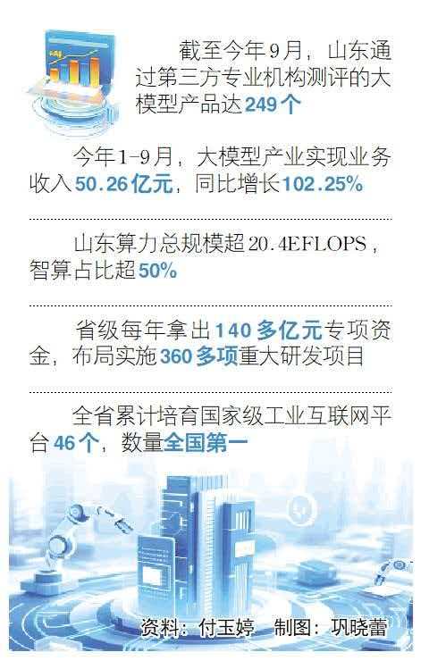截至9月,山东通过第三方专业机构测评的大模型产品达249个,在矿山开采、汽车设计、药物研发等许多领域成为好帮手;今年前9个月大模型产业实现业务收入50.26亿元,同比增长102.25%。“制造”向“智造”跃迁,传统向新兴迭代……人工智能赋能千行百业的图景背后,是算力洪流奔涌不息。公路等传统基础设施承载人流和物资运转,打通地域阻隔,而智算中心为代表的新型基础设施畅通数据循环、织就运算肌理,推动着人工智能从“费力触碰”走向“触手可及”。