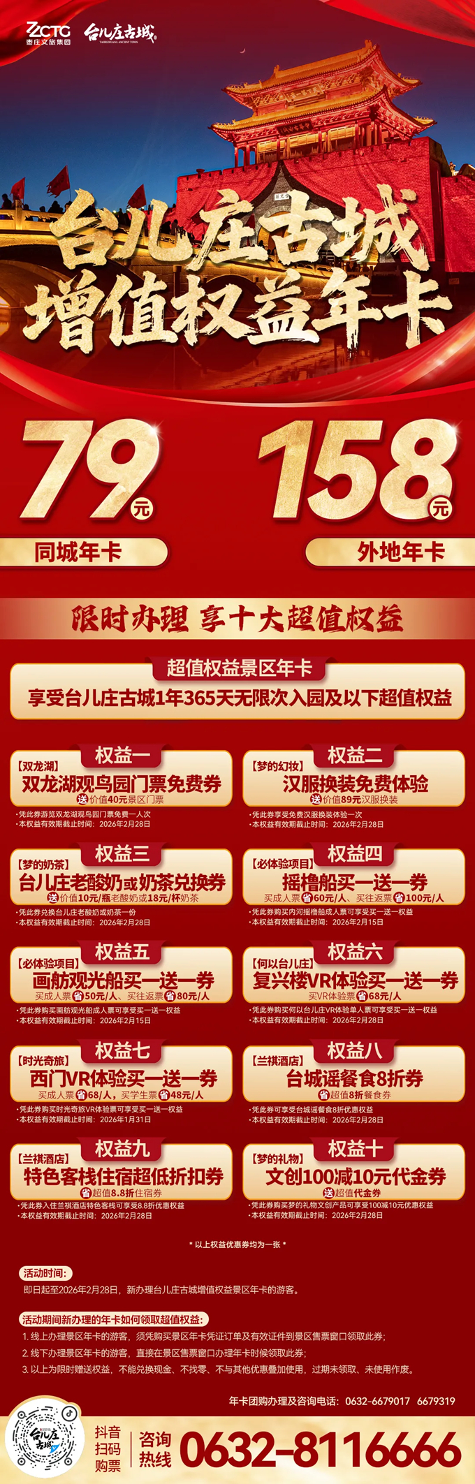 台儿庄古城增值权益年卡,正是为你备下的这份“深度相识”的请柬。它不只赋予你365日自由出入“天下第一庄”的从容特权,更精心包裹了十重超值权益,如同十把钥匙,逐一开启古城不同维度的美。