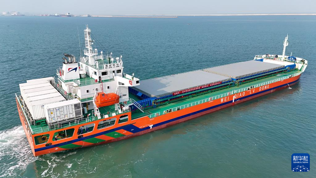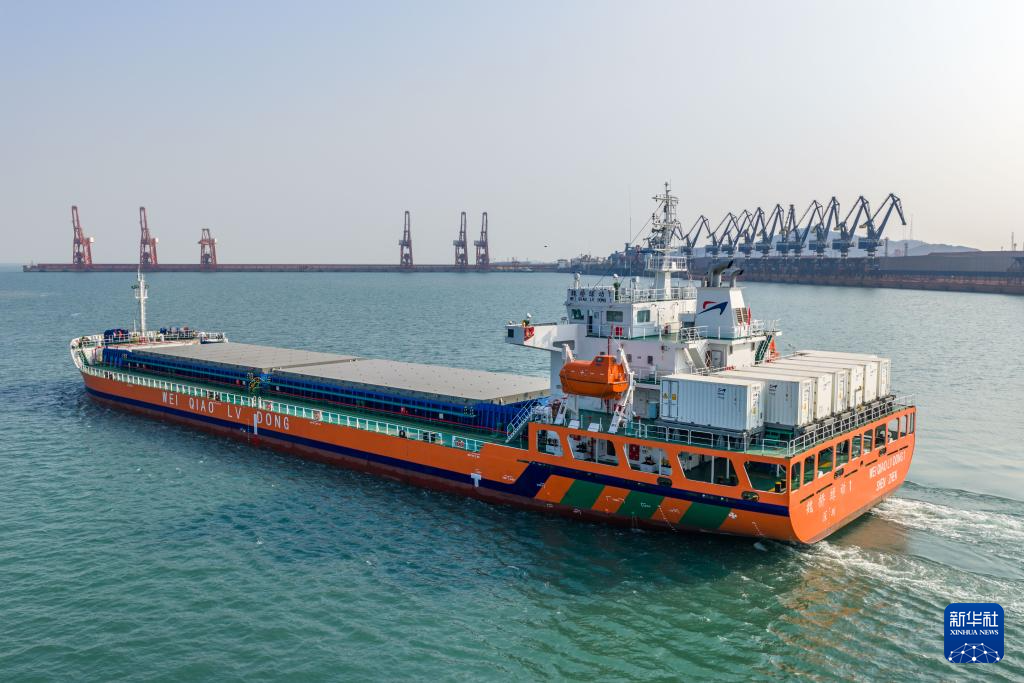 12月27日,新能源散货船“魏桥绿动1”轮从山东港口烟台港西港区起航前往山东省滨州市无棣创业码头(无人机照片)。新华社发(张超摄)