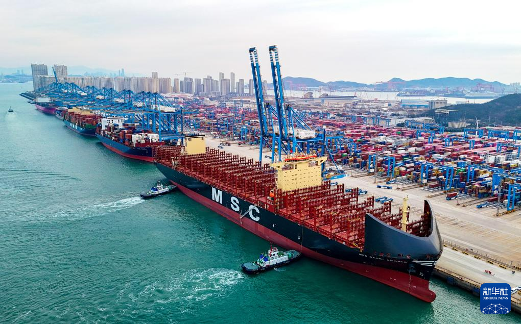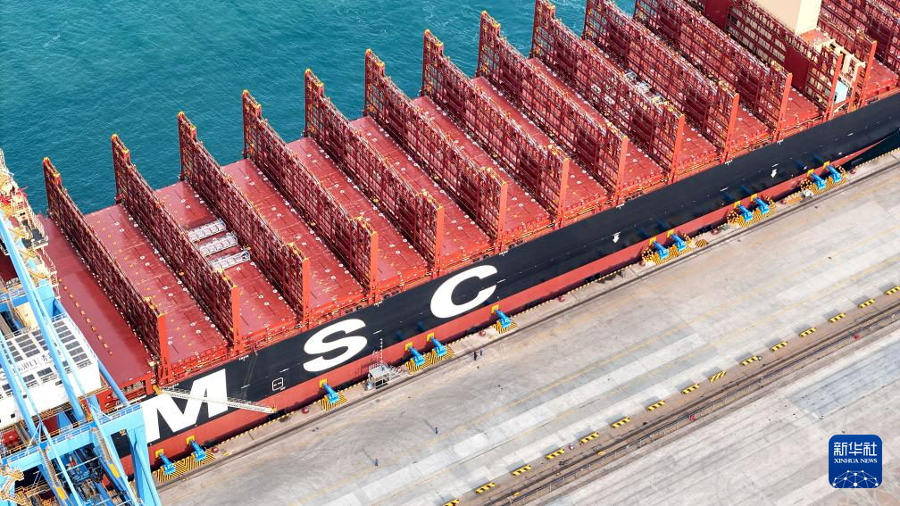 2026年1月1日,在山东港口青岛港,“地中海沙特阿拉伯”轮通过真空式自动系泊系统停靠码头(无人机照片)。