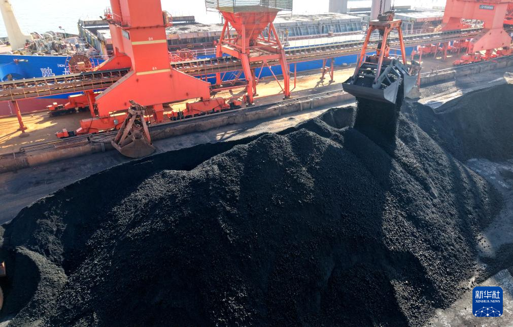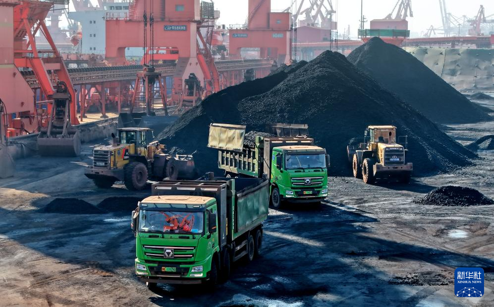 1月5日,在青岛港前湾港区86泊位,工程车辆在进行煤炭转运作业(无人机照片)。新华社记者 李紫恒 摄