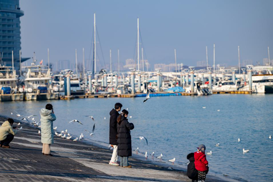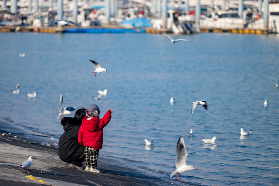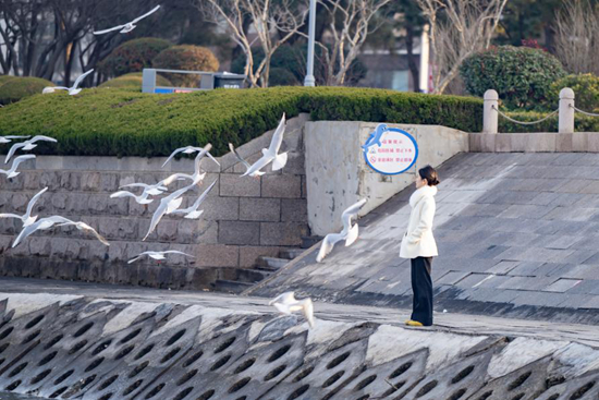 白鸥振翅环绕,引游客驻足,冬日的灵动与温柔在此刻轻轻相拥。刘晶 摄