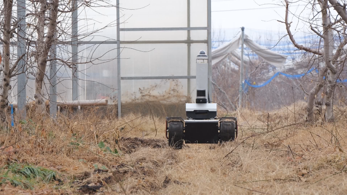 在桃园镇肥城桃现代农业产业园,冬季的桃林虽无夏日繁花与硕果,但管护工作却丝毫未松懈。一台造型灵巧的履带式巡检机器人,正沿着桃林有序自主作业。
