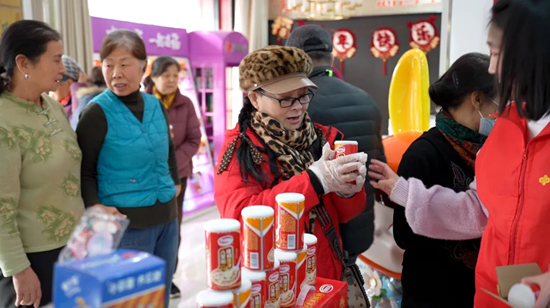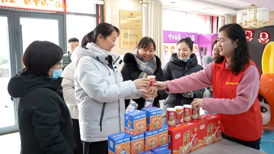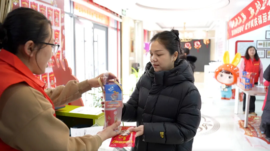 上午10时,身穿红色马甲的福彩志愿者们手持罐装八宝粥,穿梭于彩友、社区群众及环卫工人之间,为老人送上八宝粥,为社区群众递上印有生肖“马”图案的定制小礼品,向坚守岗位的环卫工人致以节日问候。