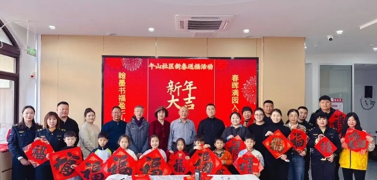 午山社区和金家岭社区则不约而同地飘起了翰墨香。书法家与爱好者们铺纸研墨,挥毫泼墨,将“一帆风顺”“万事如意”等美好祝愿凝于笔端,化作一幅幅春联和“福”字。居民们或欣赏、或请教、或领取,场面暖意融融。孩子们在书法家指导下认真写下稚嫩却真挚的“福”字,传统文化的种子在他们心中悄然播下。手写春联承载的不仅是年味,更是文化根脉的传承与邻里温情的传递。