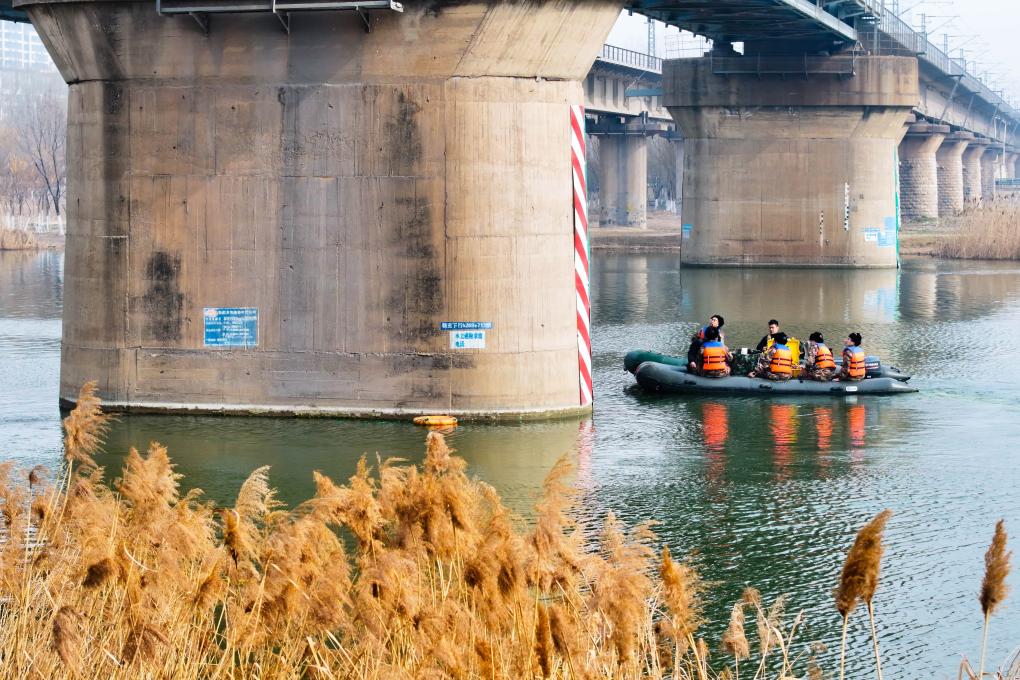 2月5日,在新(乡)兖(州)铁路梁济运河1号铁路特大桥,桥梁水下检测队工作人员开展桥墩水下检测作业。