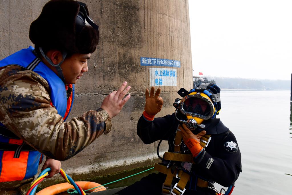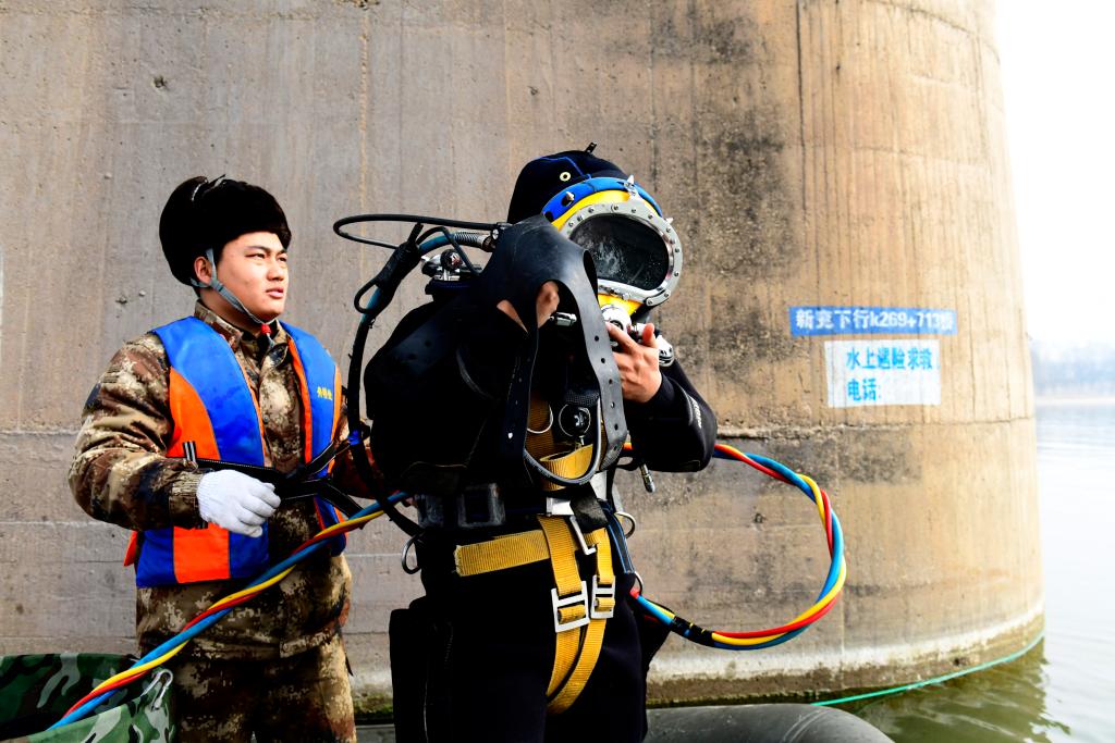 2月5日,在新(乡)兖(州)铁路梁济运河1号铁路特大桥,桥梁水下检测队潜水员准备下水作业。