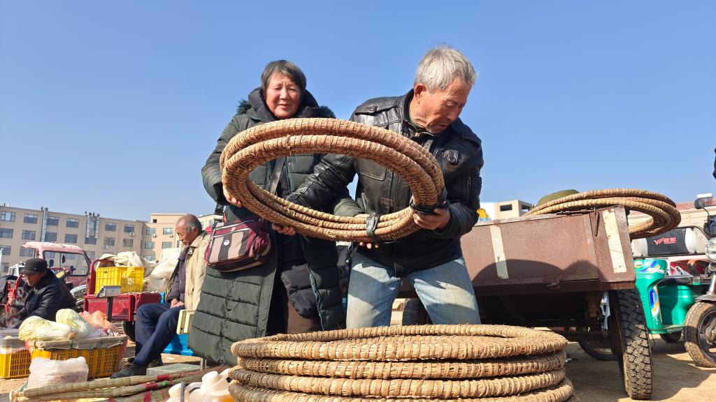 手艺人王书信(右)正在给顾客挑选手工编织的锅圈。新华社发(刘苏洋 摄)